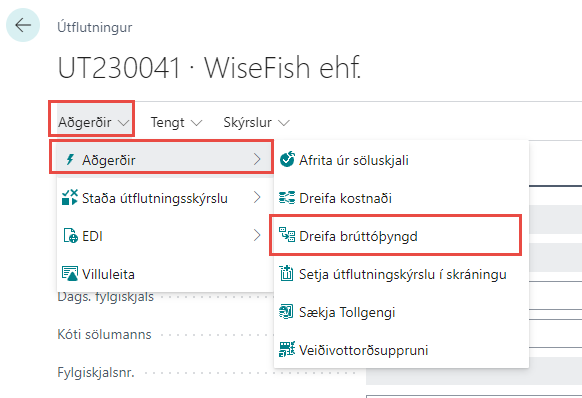 Smelltu á Aðgerðir > Aðgerðir > Dreifa brúttóþyngd.