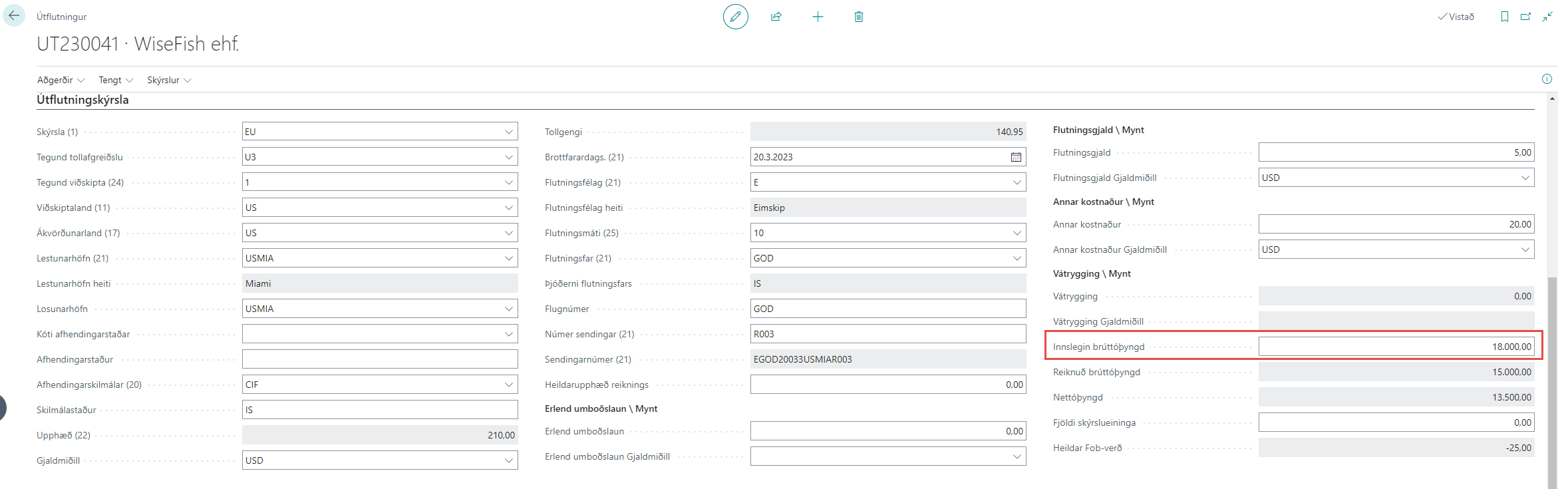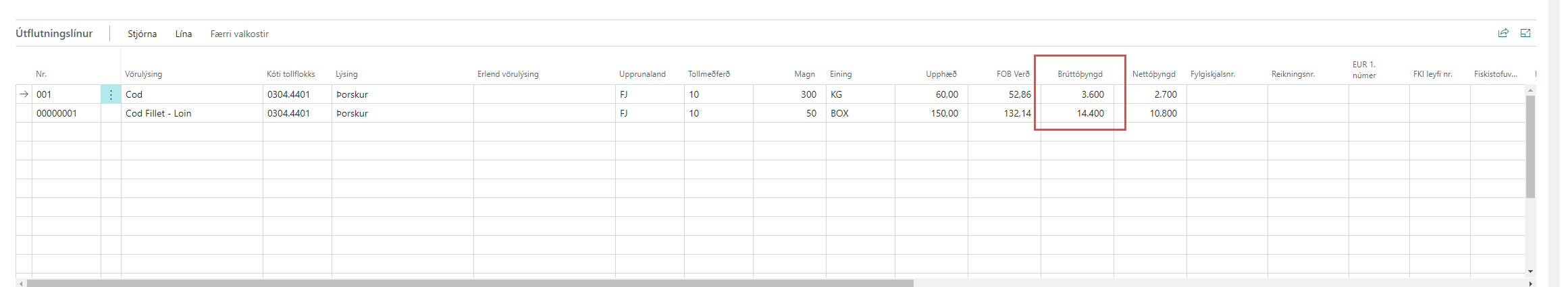 Aðgerðin Dreifa brúttóþyngd er valin séu margar línur af vörum í tollskýrslu og sundurliðuð brúttóþyngd er ekki vituð en samtals brúttóþyngd er vituð. Áður en smellt er á aðgerðina þarf að vera búið að slá inn brúttóþyngdina í reitinn Innslegin brúttóþyngd í hausnum.