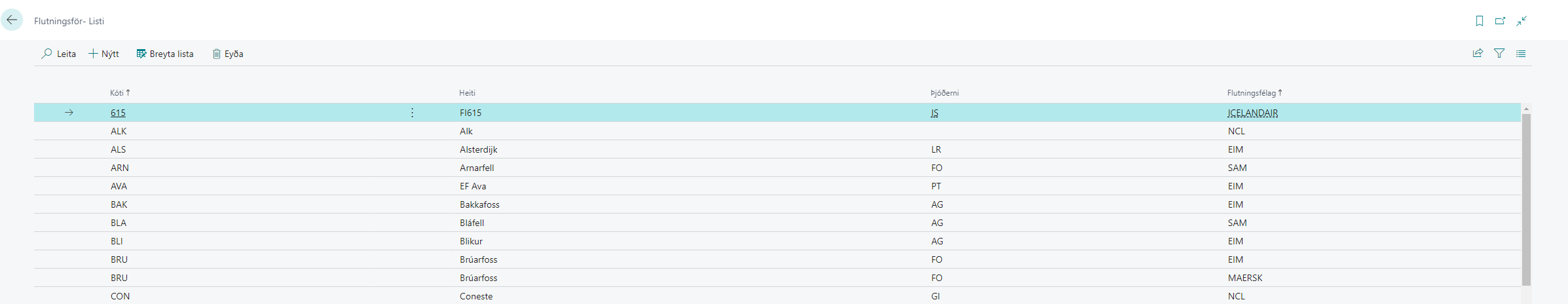 Það er gert með því að leita að Flutningsför í leitarglugganum. Þá opnast nýr gluggi og þaðan er smellt á +Nýtt til þess að búa til nýja flutningsför.