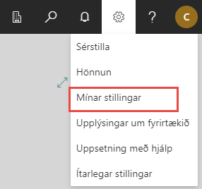Til þess er farið í Mínar stillingar. Til þess að breyta mínum stillingum er tannhjólið í hægra horninu valið og smellt á Mínar stillingar (eða alt+t).