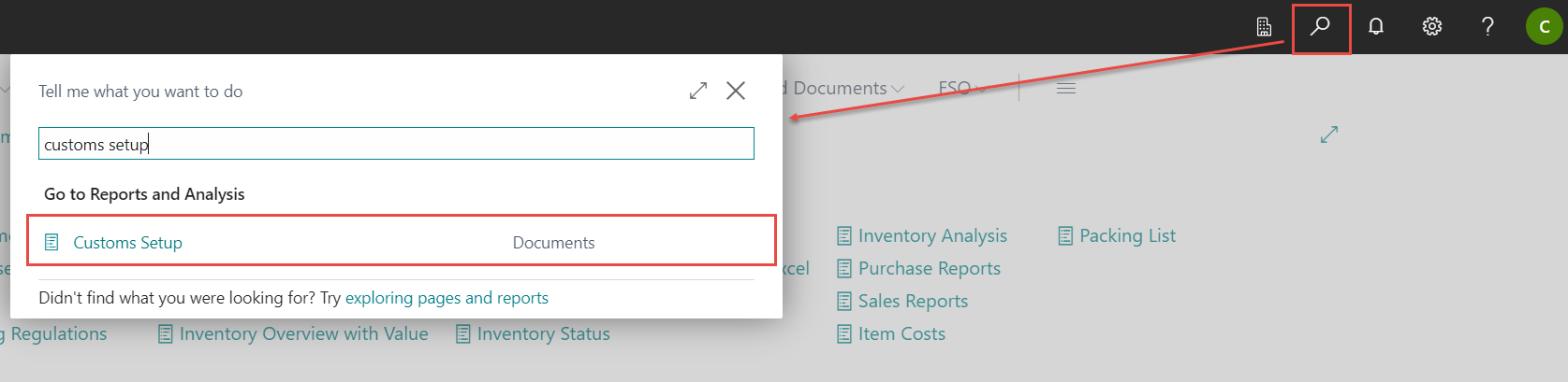 To activate the Customs Module go to the Customs Setup. To find the setup, search for Customs Setup in the search window and click the option.
