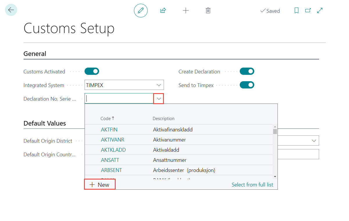 When selecting a number series it is possible to either select an existing Customs No. Series or create a new one. To find an existing one use the text box to search for it and then select it from the list. To create a new one click on the drop-down menu and then +New.