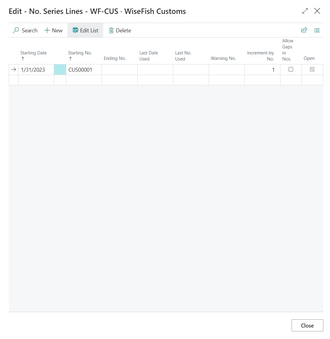 To fill in the Starting No., click on the field and a new page opens. Fill in the Starting Date and Starting No. If the user would like to have an Ending No. they can fill that out here too. It is not common to set an Ending No. Click Close when done.