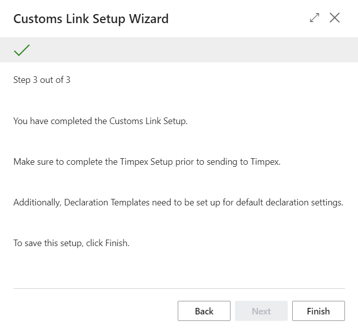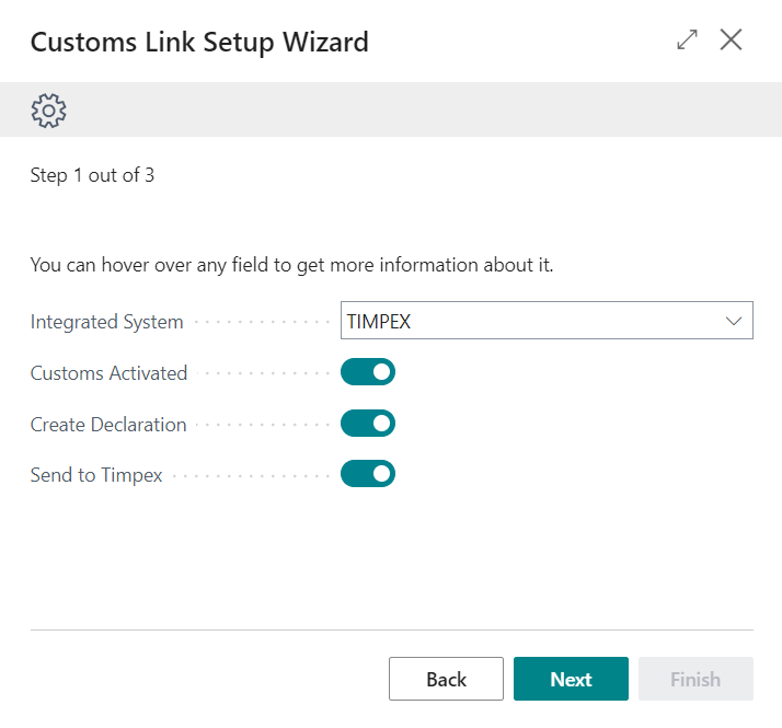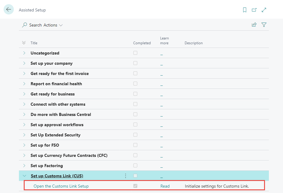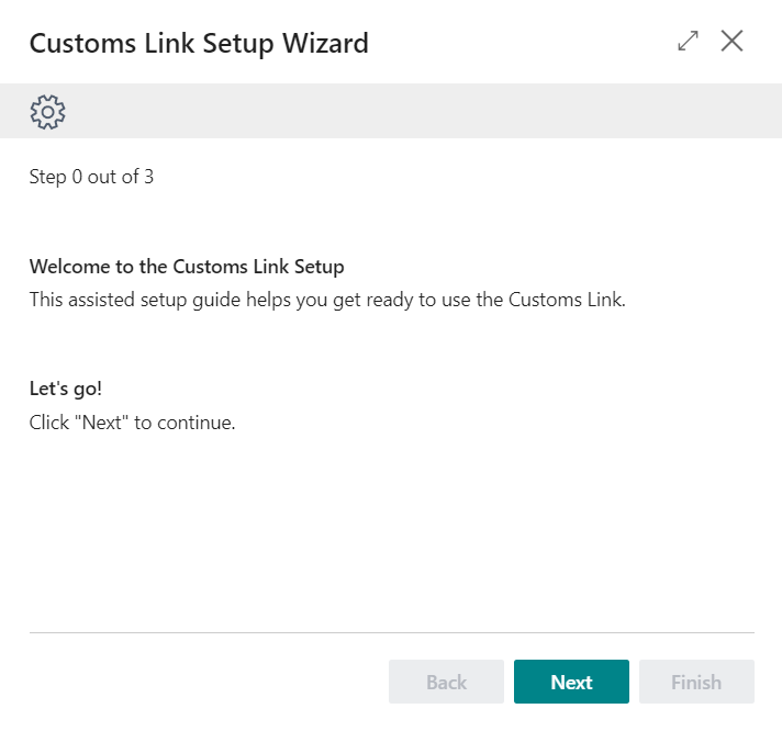 The information below shows how the Customs Link module is set up using the Assisted Setup. The Assisted Setup guides the user through the setup process and configurations of the solution.