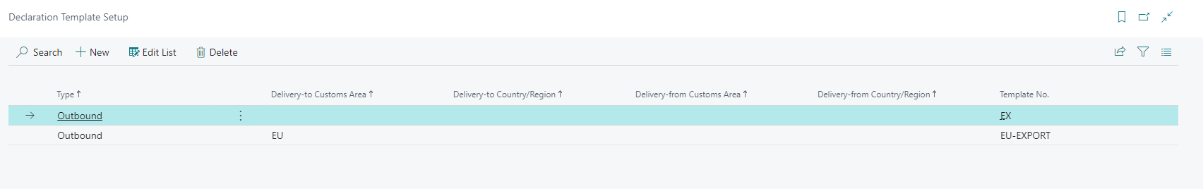 The Declaration Template Setup is a setup that involves selecting a template that was created in the Customs Declaration Templates setup and assigning it to a Country/Region and Customs Area.