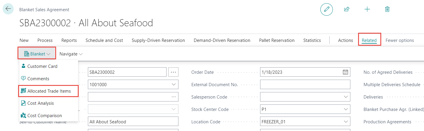 To view the allocated trade items for this blanket sales agreement click Related > Blanket > Allocated Trade Items. If the action Related is not visible click More Options.