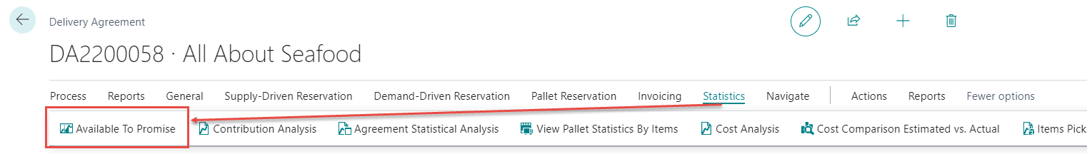 When the Delivery Agreement lines has been filled out go to Statistics > Available to Promise located on the ribbon.