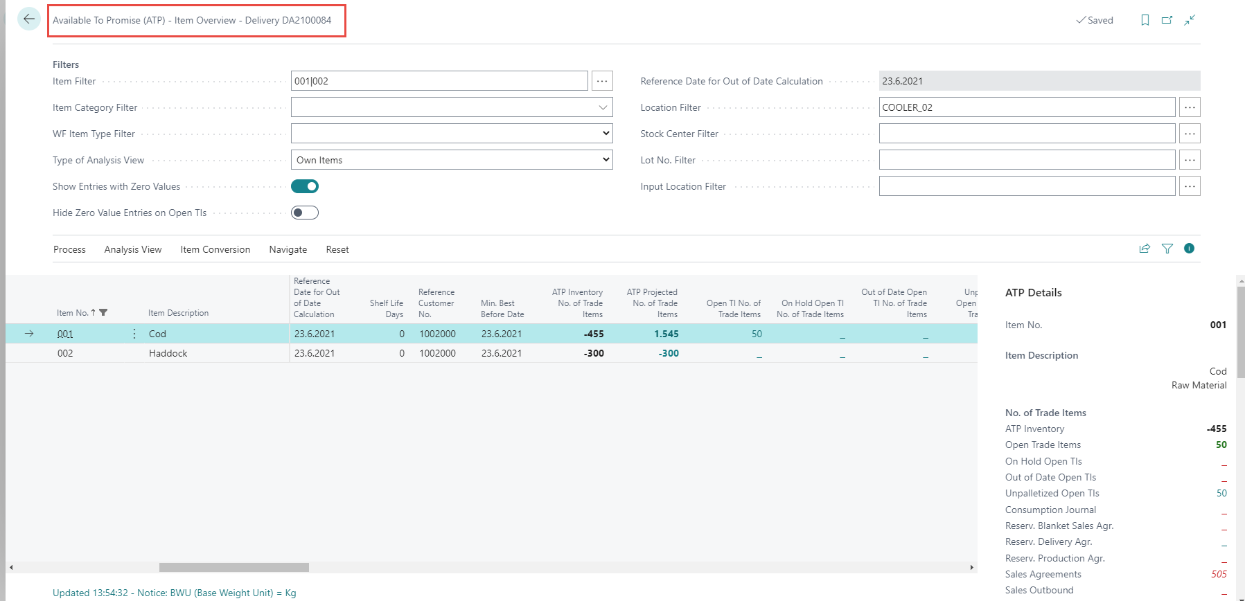 The Available To Promise (ATP) - Item Overview page opens. The system filters the search/overview based on information in the Delivery Agreement.