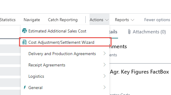 When the appropriate Agreement has been found and opened select Cost Adjustment/Settlement Wizard from the Action tab on the ribbon.