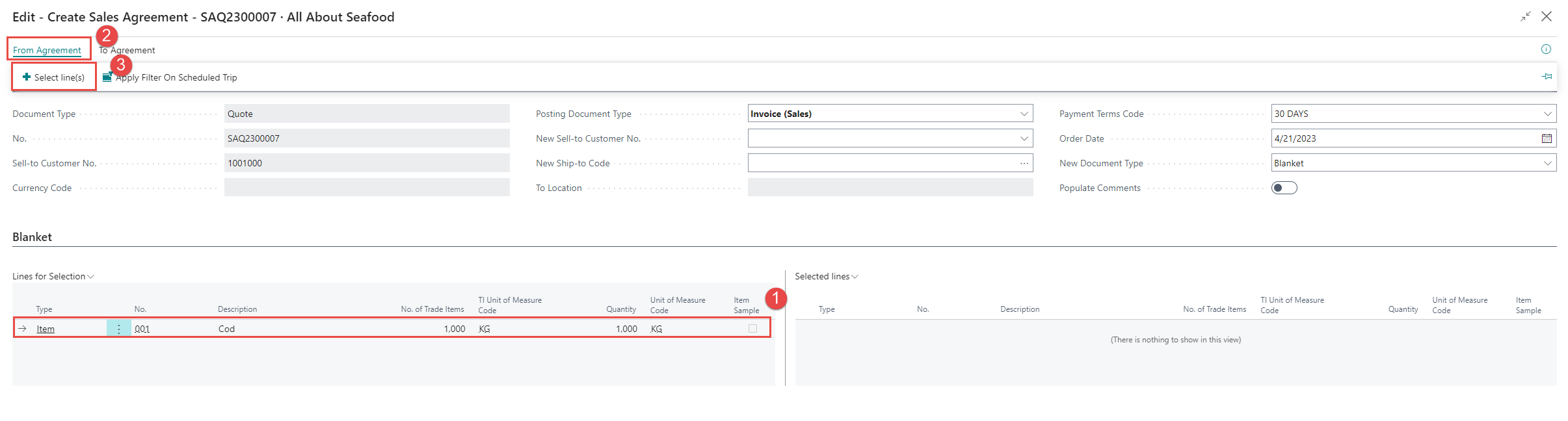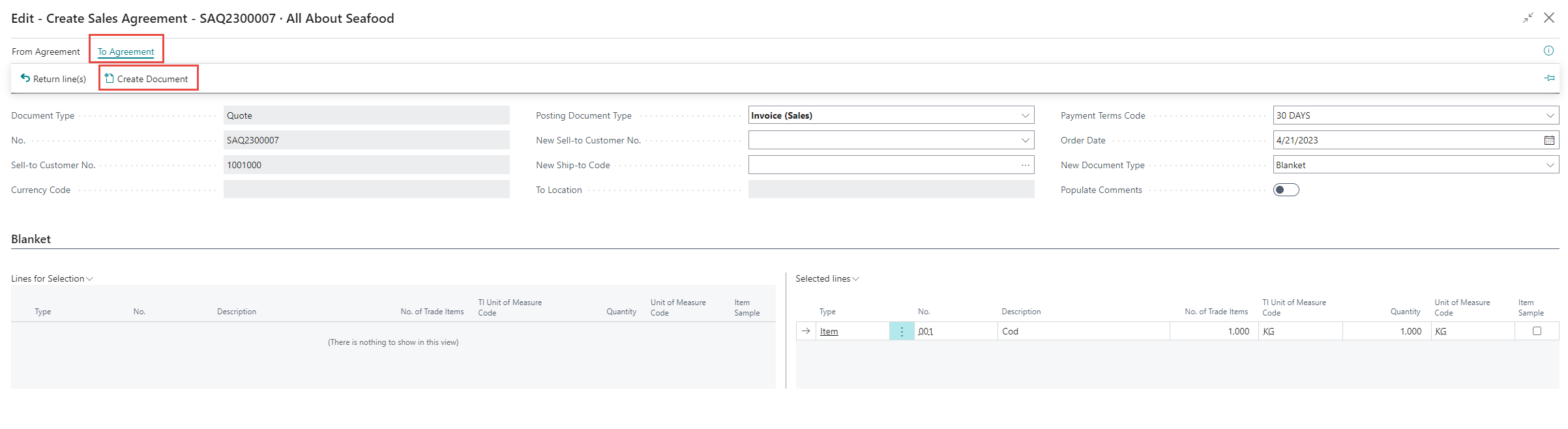 A new page opens up. Select Blanket in the header. The Blanket option will create a Blanket Sales Agreement when a document is created after the lines have been selected from the quote agreement.