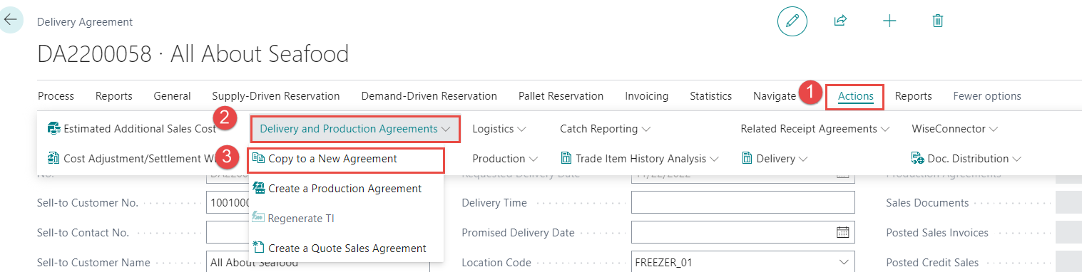 In the Actions tab from the ribbon select the action Delivery and Production Agreements > Copy to a New Agreement.