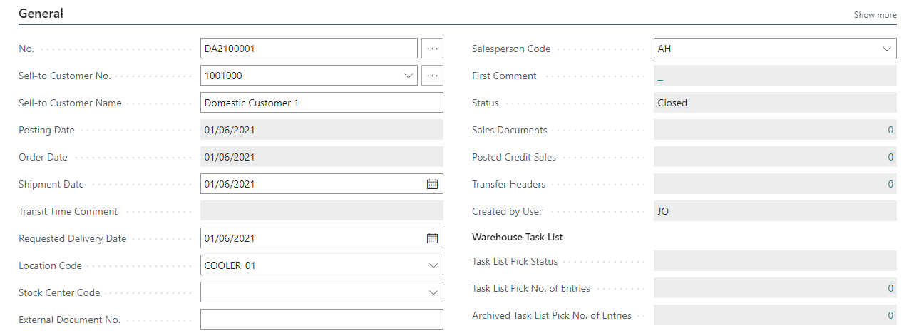 The general tab at the top of an Agreement page is often referred to as the Header of an Agreement. In the header a Customer is selected. When the Customer is selected in the Delivery Agreement, the system automatically fills in the fields according to the configuration of the Customer Card. This information can be edited and changed in the Delivery Agreement. It is possible to edit white fields but grey fields are locked for editing.