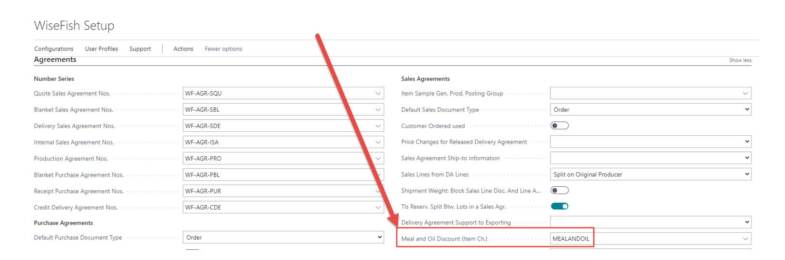 For the discount feature to work there must be an item charge selected in the field Meal and Oil Discount (Item Ch.) under the agreements tab in the Wisefish setup that will be used for the posting and cost distribution of the discount.