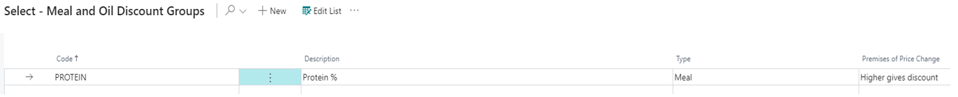 In the Meal and Oil Discount Groups there are two field (beside code and description) that must be filled in and they are Type and Premises of Price change.