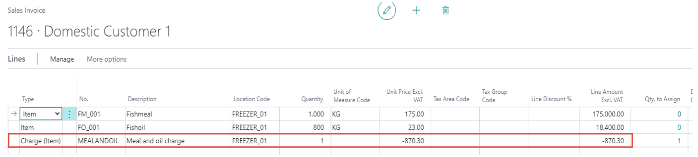 After the discount has been setup and calculated the delivery agreement is released and a posting document is created as with a normal delivery agreement. The sales invoice that is created will include the item lines from the agreement as well as an item charge, which contains the calculated discount from the Fish Meal and Oil tab. If the user is satisfied with the invoice it can now be posted.