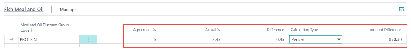 When the discount group has been selected in the Fishmeal and Oil tab then the criteria for the discount calculation must be entered in the remaining fields which are: