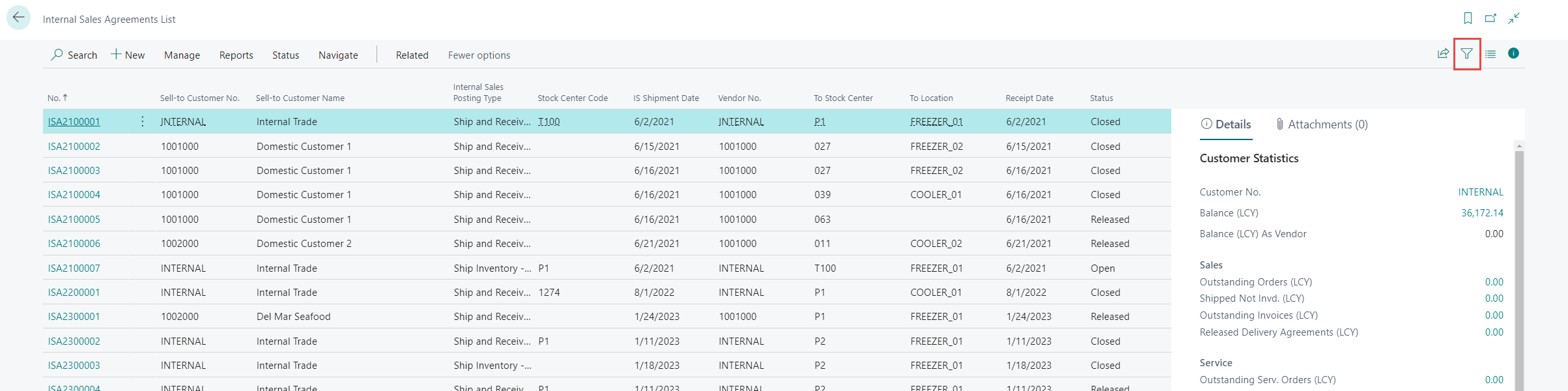 The Internal Sales Agreement List displays all Internal Sales Agreements without a filter. It is possible to add filters and customize them for a quicker search. Use the filter icon.