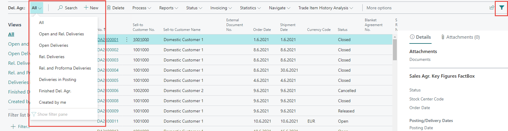 To view a list of all Delivery Agreements, use the Delivery Agreements List. The list contains all Delivery Agreements created in WiseFish and automatically sorts the Agreements by date, regardless of status (Open, Closed, Cancelled, Released). The list can be useful when looking up or filtering on certain Delivery Agreements.