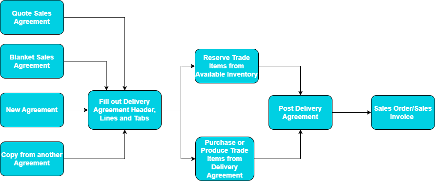The first step of the process would be to fill out the Delivery Agreement Header. The Header contains information on the customer, shipping terms and other information. Other sub-sections are optional to fill out and depend on the needs of each user. The following step is to fill out the Delivery Agreement Lines. The user is required to do so in order to sell the Trade Items. There are several methods to fill out the lines depending on whether Trade Items exist in the system or not. The user then chooses which method to use.