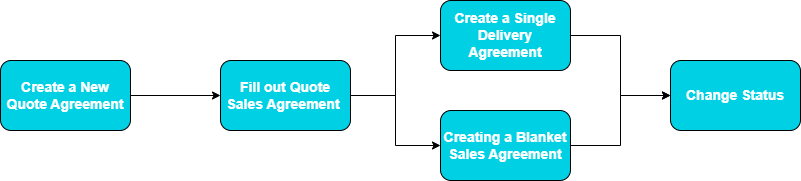 The user can either create a single Delivery Agreement or a Blanket Sales Agreement to create scheduled deliveries. The final step is to change the status of the Quote Sales Agreement.