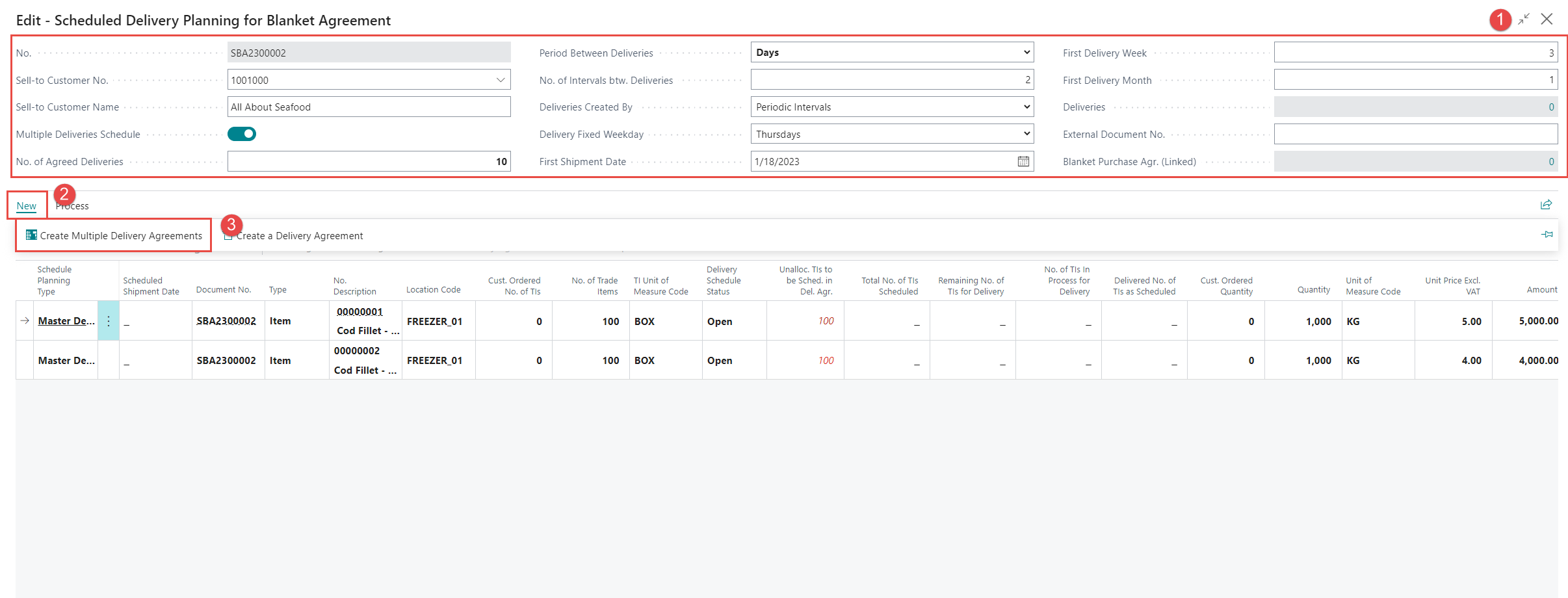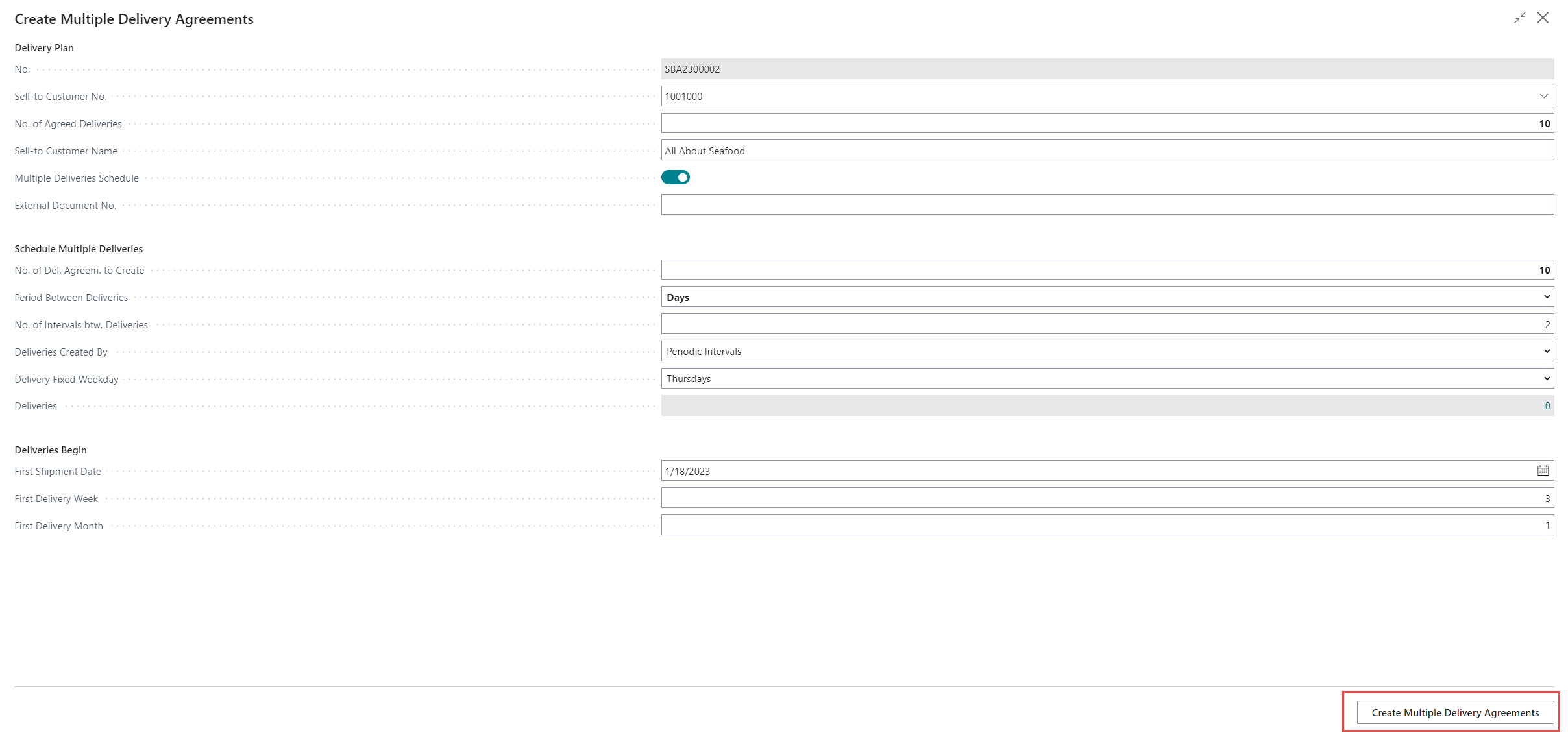 The user defines the frequency of deliveries; days/weeks/months, in the field Period Between Deliveries. The field Multiple Deliveries Schedule serves the purpose of guaranteeing the connection between a delivery agreement line and a blanket agreement line. That can be useful e.g., if a user creates a new line in a delivery agreement (adds a product number) that doesn't have a connection to a line in the related blanket agreement. If the field is marked, then the system checks if the delivery agreement was created from a blanket agreement and if it has a confirmed connection, e.g., a value in the field Blanket Sales Agreement No. in the header. If the blanket agreement in question has been flagged as Multiple Deliveries Schedule in its header, then the system doesn't allow the creation of sales posting documents for the selected delivery agreement unless all its lines are connected to a specific line in the linked blanket sales agreement.