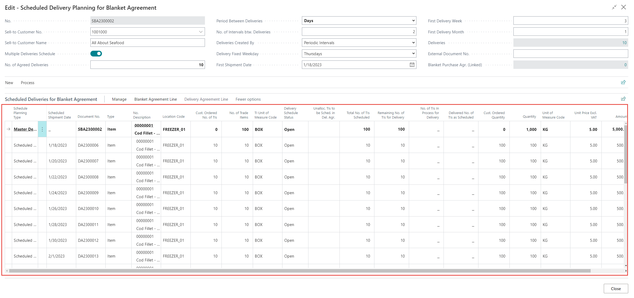 The delivery plan is updated automatically and now shows all the deliveries that are scheduled from the blanket sales agreement.