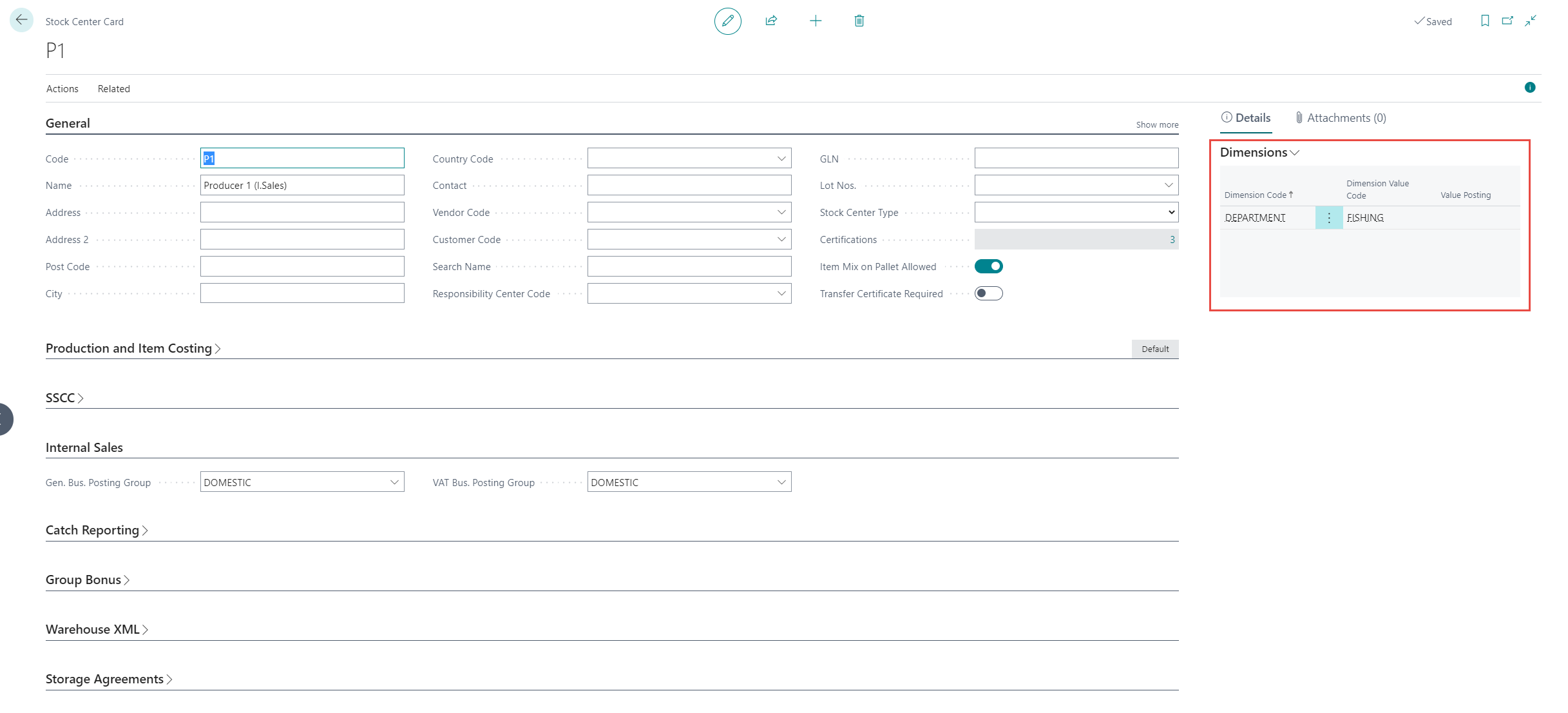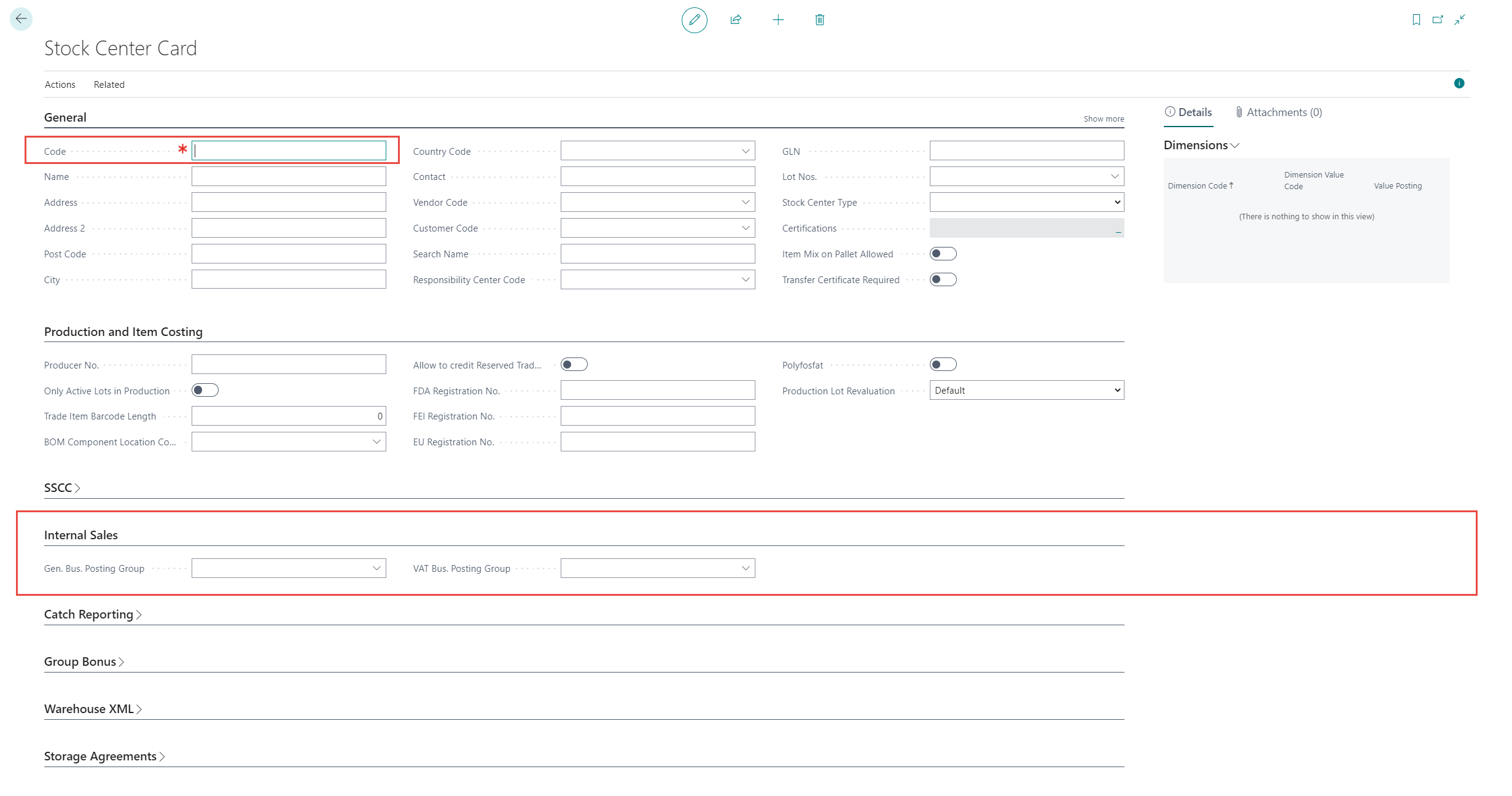 In the Stock Center Card, the Code needs to be filled out – other information could also be added. Under the Internal Sales tab the Gen Bus. Posting Group and VAT Bus. Posting Group can be filled out to control the posting setup for that stock center.
