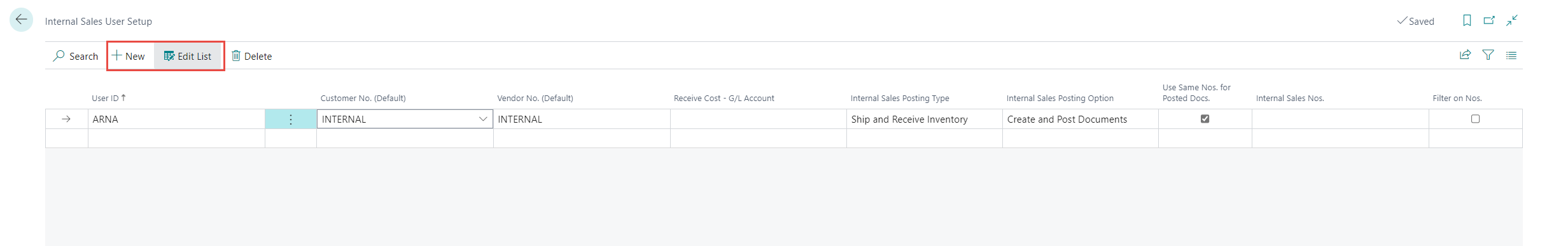 To create a new user setup +New in the Internal Sales User Setup. To edit an existing user click Edit List.