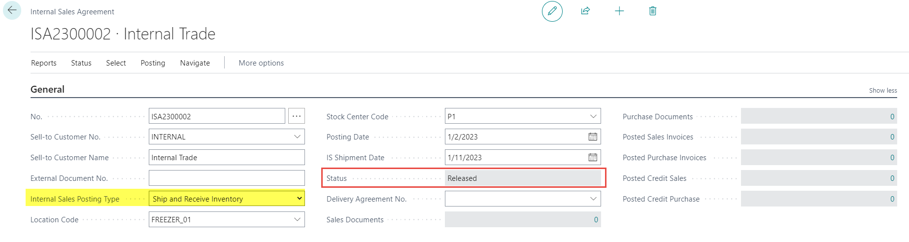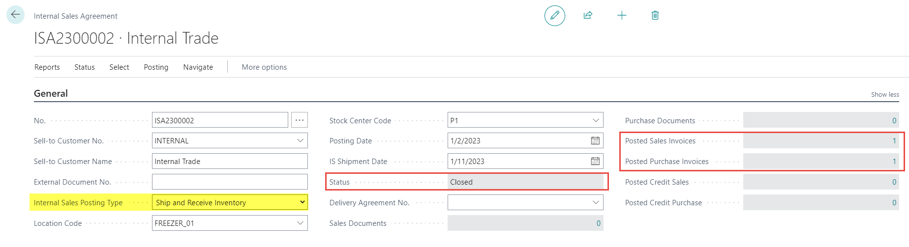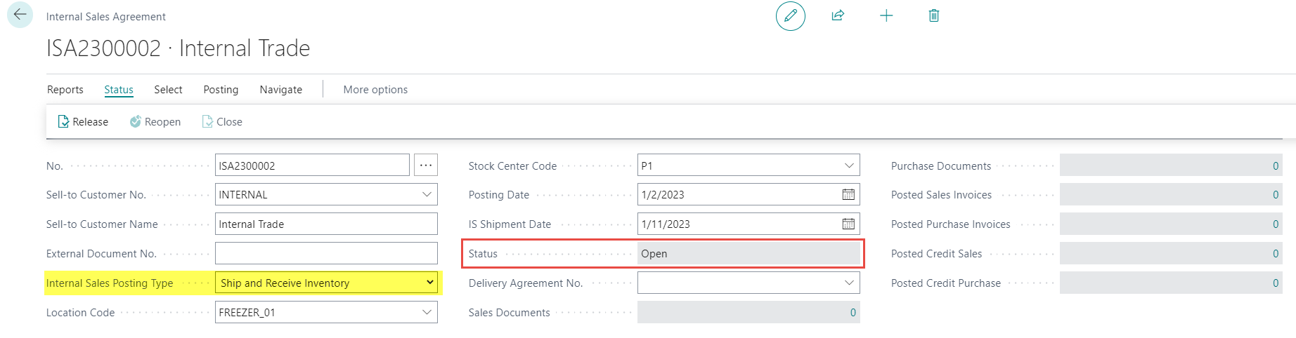 The status of a completed internal agreement is changed from Open to Released to Closed. Two unposted documents are created, a sales document and a purchase document.