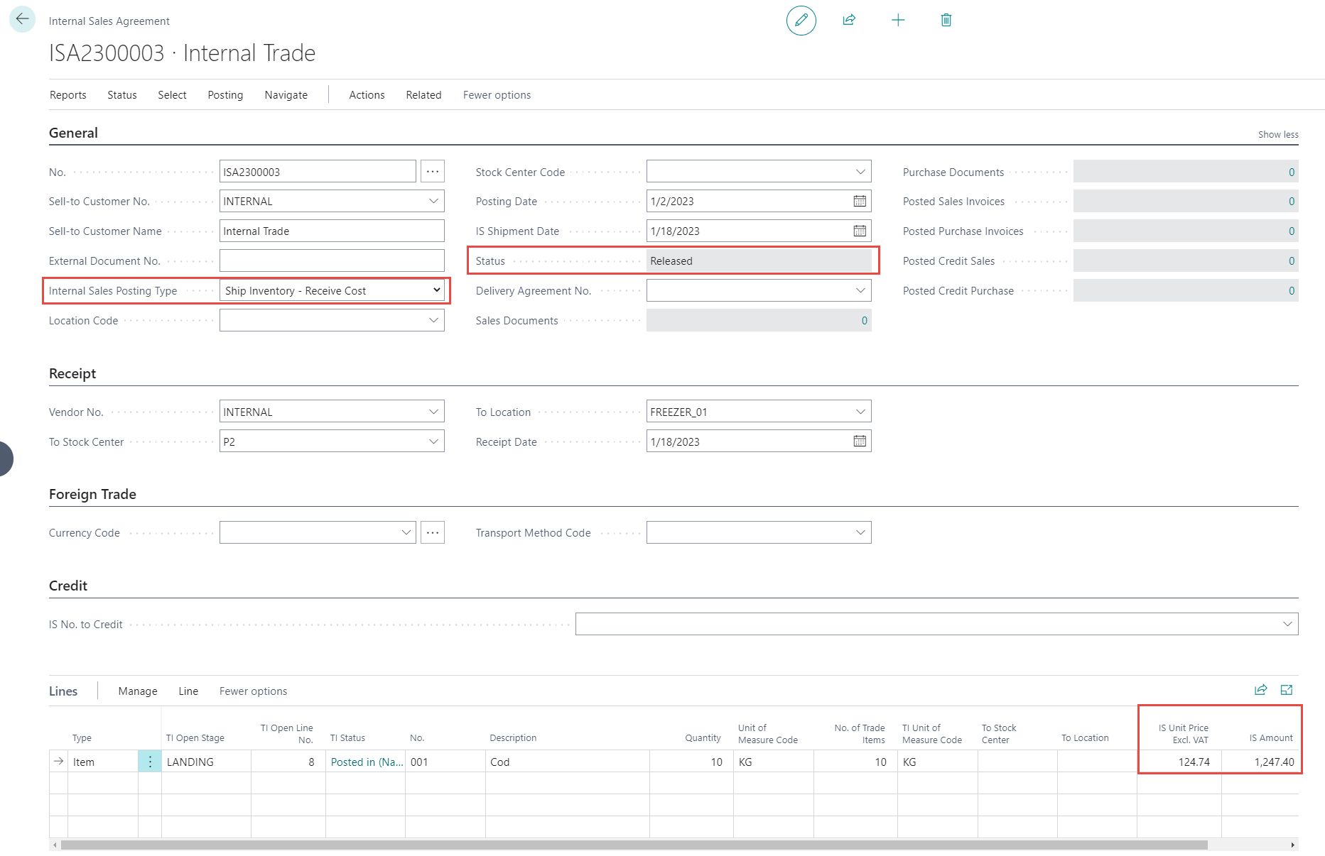When inventory is moved to a location where there is no stock keeping in place, then the Internal Sales Posting Type selected is Ship Inventory - Receive Costs. The agreement is filled out the same as prior. Unit price is added to the line(s) and the agreement is released. Click Status > Release to release the agreement.