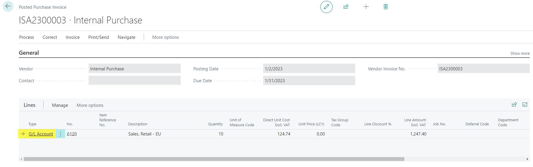 When the Internal Agreement has been released and the action Post is selected from the ribbon, the unposted internal sales- and purchase documents are created and need to be posted as with the Ship and Receive Inventory method. The sales document is posted as before but the purchase document is created with a line with the type G/L account instead of the type Item.