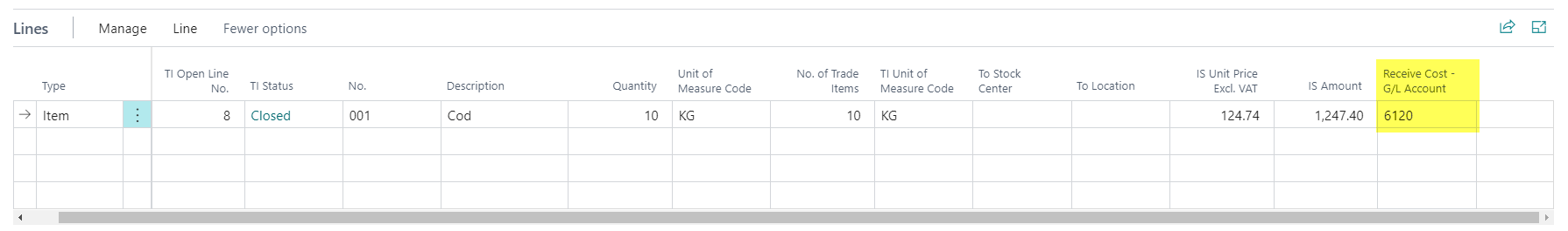 Note that prior to posting, the user must fill in the Receive Cost - G/L Account field in the Internal Sales Agreement Lines. See image below.