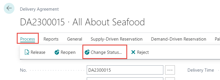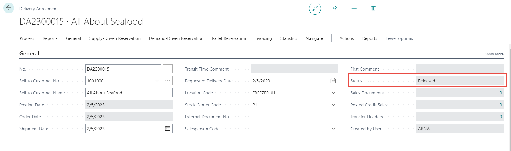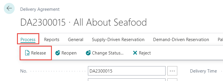 When the delivery agreement has been reviewed it is confirmed with the action Release from the ribbon. To Release a Delivery Agreement, the lines do not have to be reserved (green and bold). Click Process > Release.
