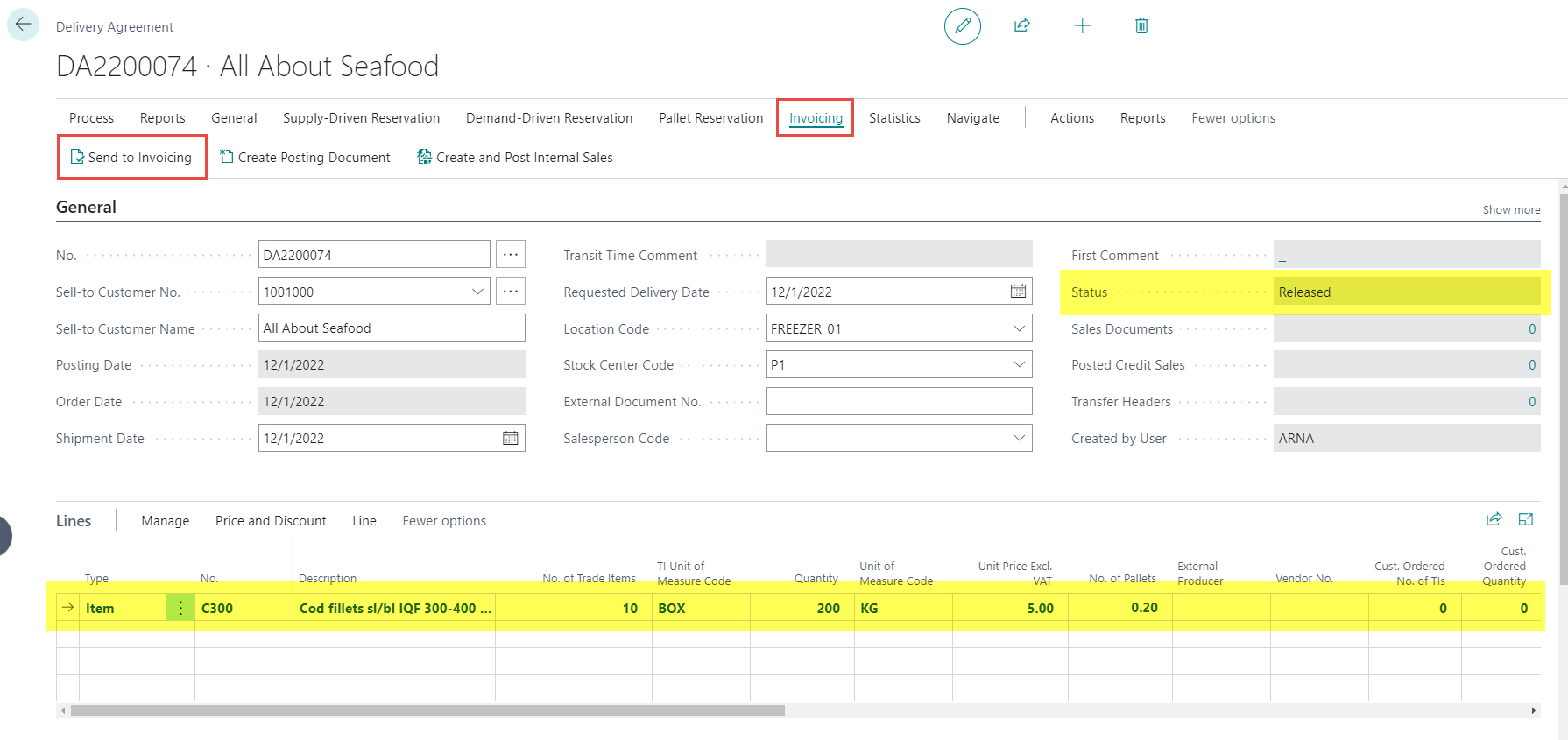 To send to invoicing make sure the Delivery Agreement has the status Released and that the items in the agreement have been reserved (green and bold). Then click Invoicing > Send to Invoicing.