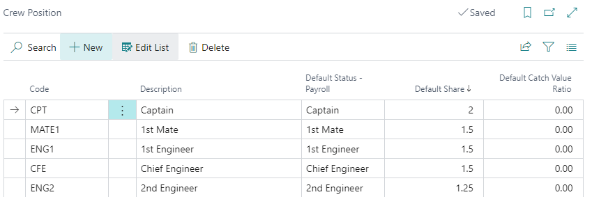 The default positions for crew members include: Captain, 1st Mate, 2nd Mate, Chief Engineer, 1st Engineer, 2nd Engineer, Cook, Net Braider, Boatswain, Inspector, Baader Technician, Deck Hand, and Mess.