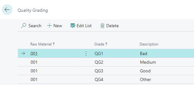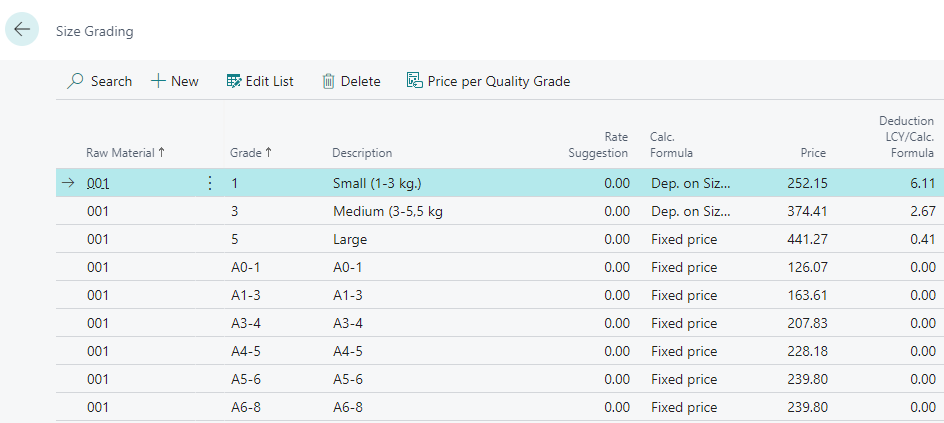 Size and quality grades can be set up for the purposes of defining raw material sales at landing.