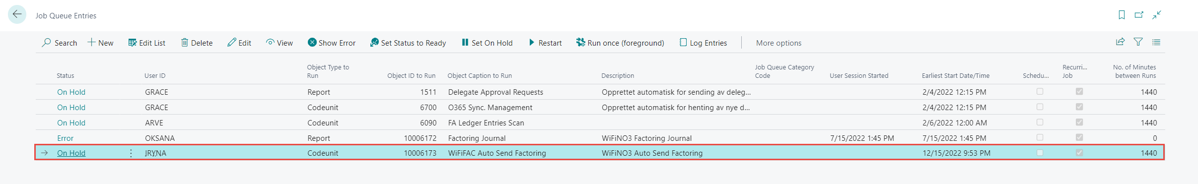 A job queue is used to send factoring files to the bank using Codeunit 10006173. The frequency of the file delivery is set in the job queue.