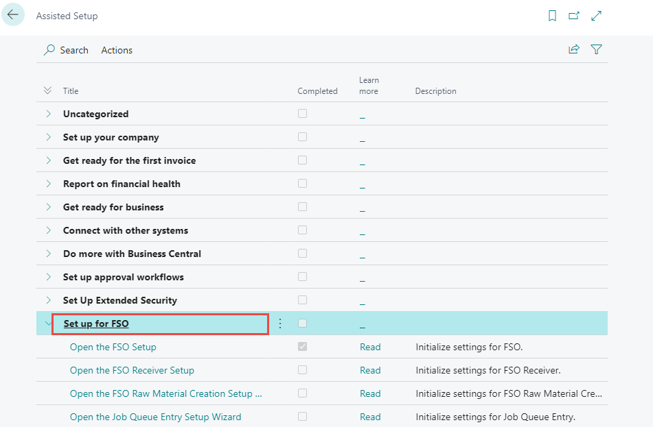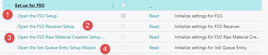 The information below shows how the FSO module is set up using the Assisted Setup. The Assisted Setup guides the user through the setup process and configurations of the solution.