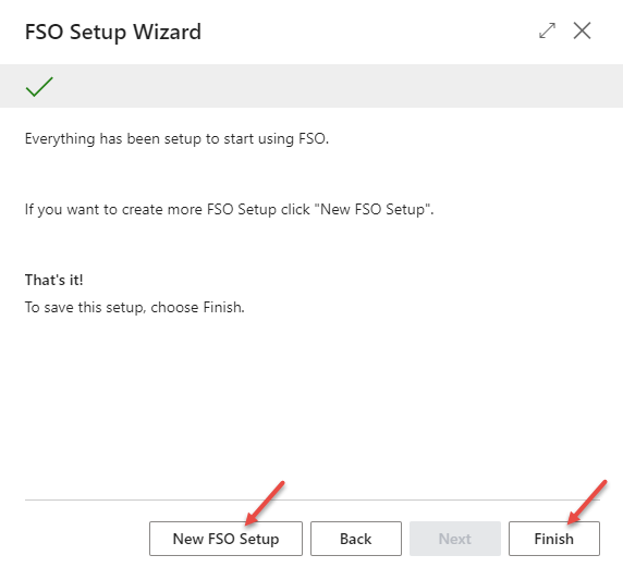 When all pages have been filled out, either save the setup by clicking on Finish or create a new FSO Setup by clicking on New FSO Setup located on the last page.