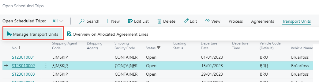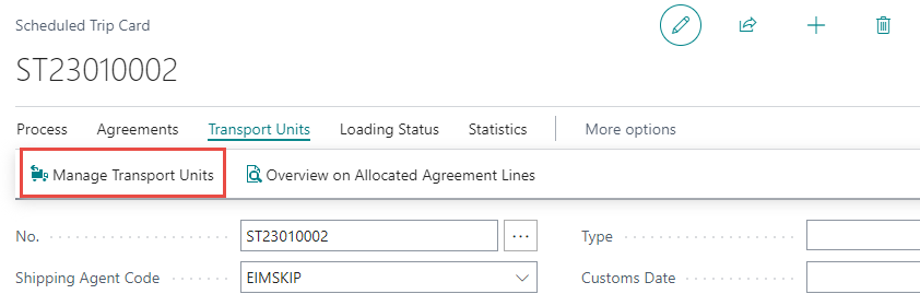 The Manage Transport Units functionality is available within scheduled trips from both list and card pages.