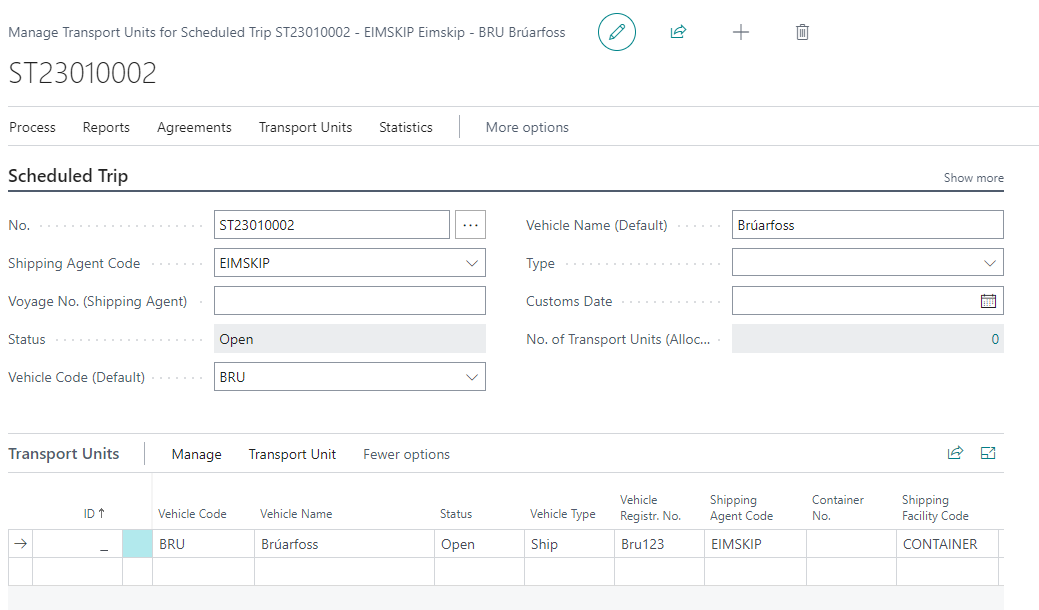 By adding registration in the lines or changing the status of the line the transport unit gets its unique identifier assigned and the record for the transport unit has been inserted in the list of transport units connected to the corresponding scheduled trip.