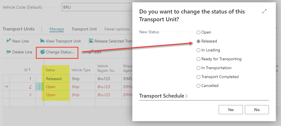 The status of the transport unit needs to be changed to Released as an indication for other users that the shipment is ready for delivery of the goods. This is usually done when all information has been added to the lines.