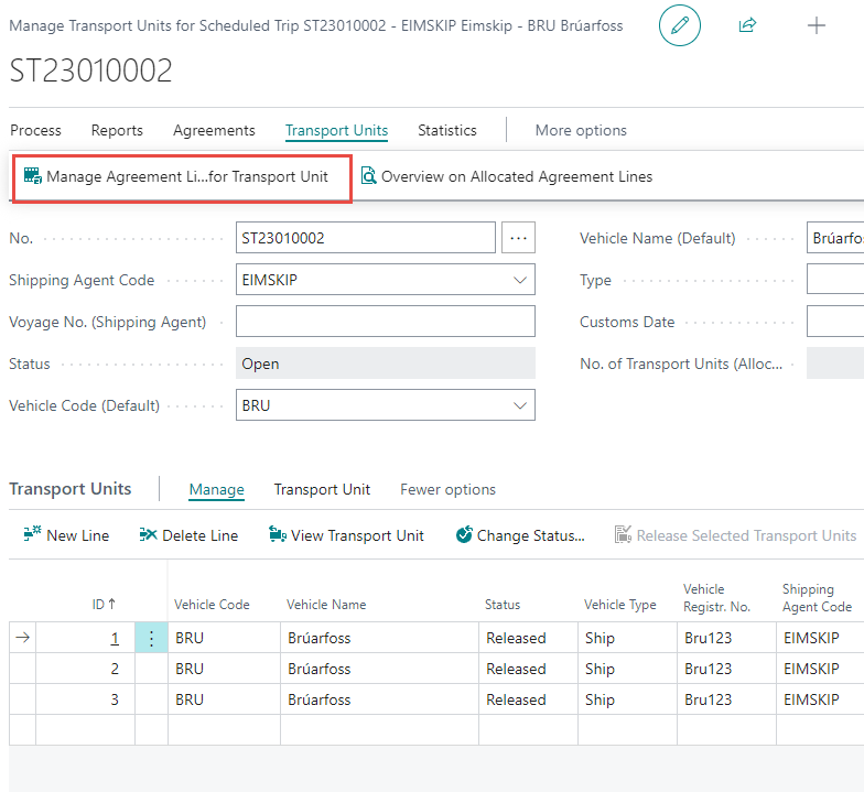 Next, the Trade Items need to be reserved for each Transport Unit. From the Manage Delivery Agreement Lines for Transport Unit page click Transport Units > Manage Agreement… for each an every transport unit on the page.