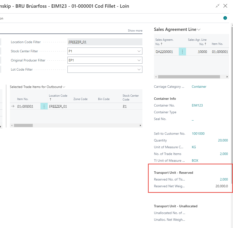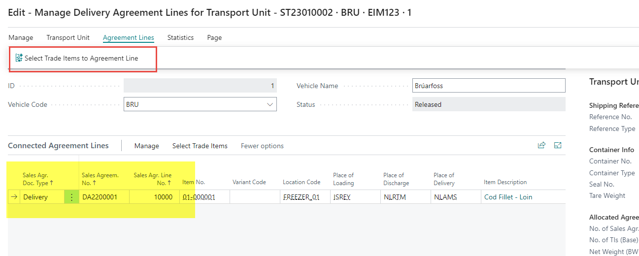 Notice how the FactBox section marked Transport Unit on the right hand side, updates after selecting trade items.