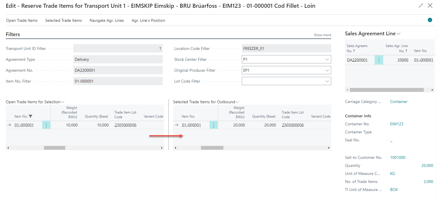 Prior to this next step the Delivery Agreement line has to be connected to Transport unit (transport unit no. 1 in this example). In order to reserve the trade items click Select Trade Items to Agreement Line.