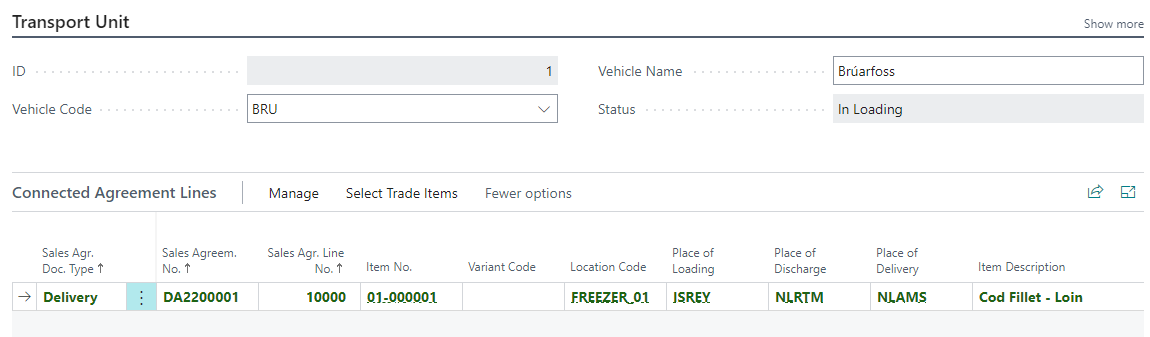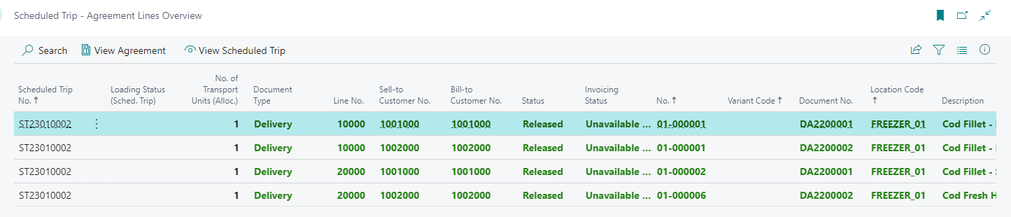 When the Reserve Trade Items for Transport Unit page is closed, the appearance of the connected delivery agreements changes for the corresponding transport unit.