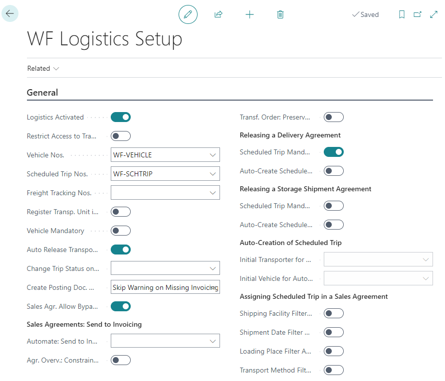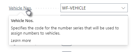 Note that there are two number series fields on this page, Vehicle Nos and Scheduled Trip Nos. A number series can be assigned to provide support to the user with automatic numbering of vehicles and scheduled trips. These fields can be left empty if the user wants to have manual control of these assignments without any additional support from the logistics setup. More information about number series can be found here.