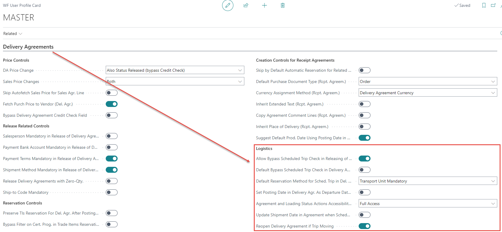 In the WF User Profile Card, the Logistics settings are located under the Delivery Agreements tab. Fill in the fields and place a checkmark where applicable. Note that the setup can differ between companies.