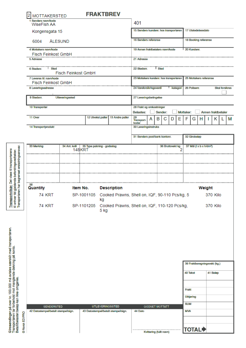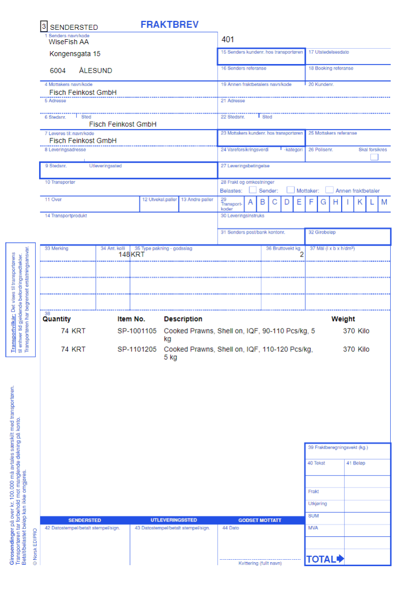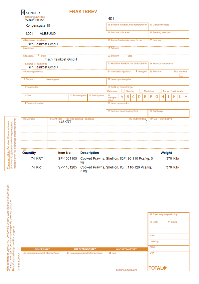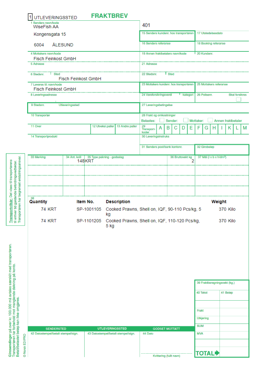 The freight document contains freight information for a scheduled trip. To print a freight document the user must be located on a Delivery Agreement page. Click here to see more information on the freight document. Below is an example of a Freight Document.