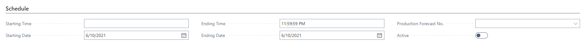 Scheduling instructions are entered in the 'Schedule' tab. If the Production Agreement is auto created from a Production Forecast, then the data is copied from the forecast. If the Active field is activated the lines in the production agreement will be produced through WisePeripherals.